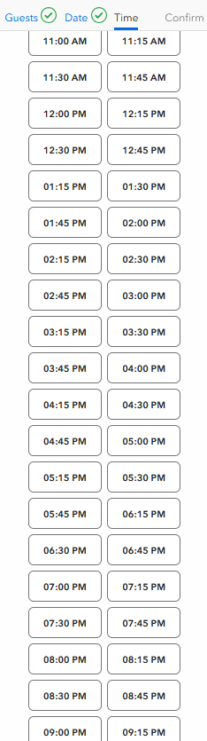 Below are the next 72 hours (as of writing) of availability in order by date. Within 24 hours of dining it shows almost full availability, even for same day booking. These screenshots are an example for a party of two, checked on Monday September 1, 2025, showing availability for Tuesday September 2 through Thursday September 3. Friday and Saturday’s available times looked identical, showing practically full availability. For reservations, visit https://www.universalorlando.com/web/en/us/plan-your-visit/dining-experiences/reservations#theme-park-dining