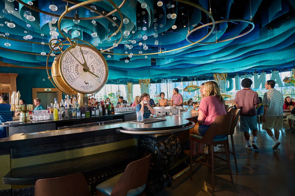 Speaking of paying attention to details, Atlantic is full of them. From the carpet to the ceiling and everything in between, you’ll find tons of nautical, whimsical, and Victorian influenced creations. Upon entering the welcome area you’ll be greeted by a host stand that resembles a gigantic brass dive helmet stuck in the sand. The polished floor beneath your feet represents that sandy ocean bottom, with seashell accents spread throughout. Looking up you’ll notice hanging light bulbs resembling bubbles, flowing blue partitions representing waves, and even some golden octopi seemingly floating above the bar top. Behind the Aquaria Bar you’ll notice a giant glowing engine order telegraph, set to full speed ahead. Pay close attention and you’ll also see “Finished With Gin” as a nod to the usual “Finished With Engine” setting of an engine order telegraph.